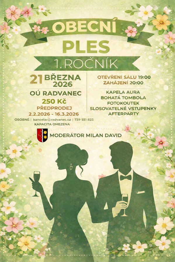 | Pozvání na 1. obecní ples v Radvanci Vážení občané, milí sousedé a přátelé Radvance, srdečně Vás zveme na 1. obecní ples, který se uskuteční Přijďte si užít příjemný večer plný hudby, tance a dobré nálady, skvělého programu a společně tak zahájit novou tradici obecních plesů v Radvanci. 🎟 Předprodej vstupenek bude zahájen od 2. února 2026. REZERVUJTE SI SVÉ MÍSTO VČAS! Zároveň si Vás dovolujeme s pokorou požádat o drobné či větší dary do tomboly. Vaše dary pomohou vytvořit nezapomenutelný večer plný překvapení, radosti, setkávání a společné zábavy. Případné dary můžete doručit na Obecní úřad Radvanec nebo nás kontaktujte: Dary prosíme doručit nejpozději do 6. března 2026. Děkujeme Vám za Vaši štědrost, podporu a ochotu přispět. Těšíme se na Vaši účast a společné setkání! S přátelským pozdravem Obec Radvanec |