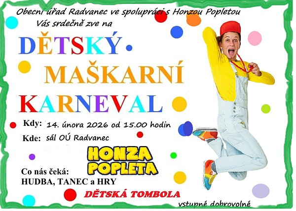 Obec Radvanec vás zve na DĚTSKÝ MAŠKARNÍ KARNEVAL S HONZOU POPLETOU